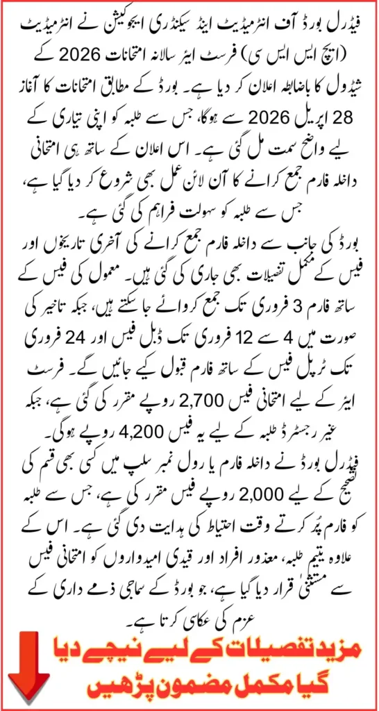 The Federal Board’s announcement provides a complete framework for the 2026 Intermediate First Year exams. Instead of releasing information in parts, the board has combined the exam schedule, admission dates, and fee details in one notification.