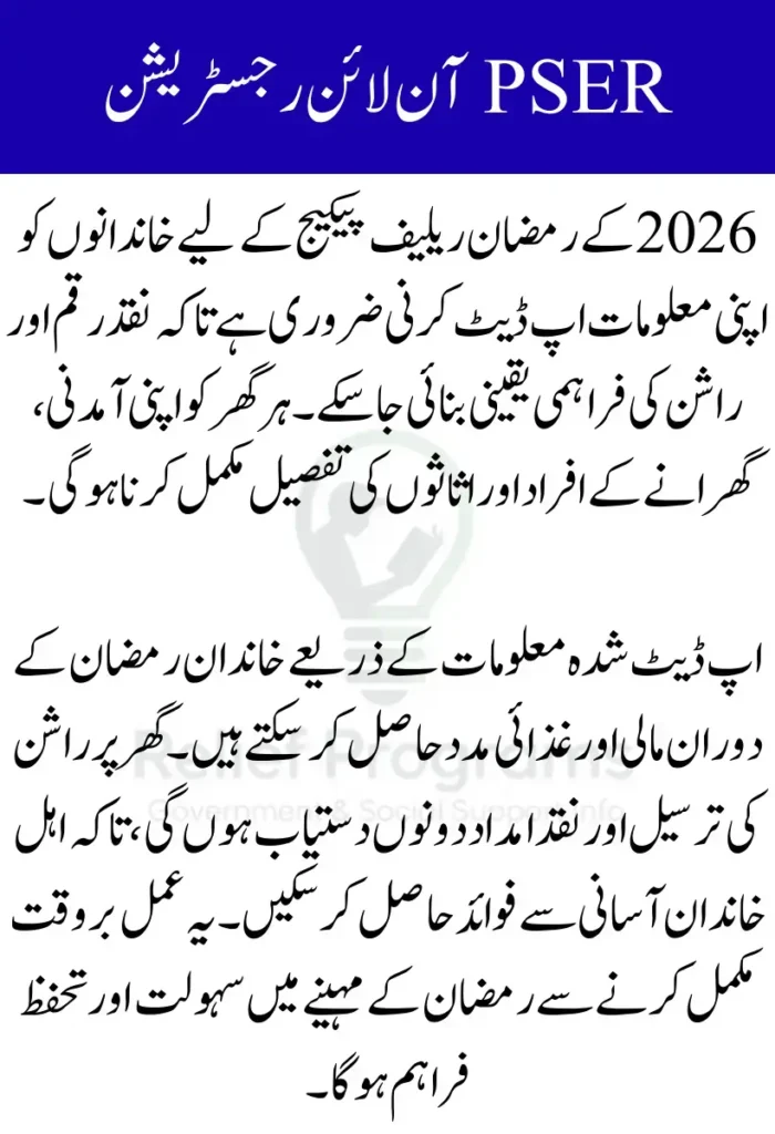 The Punjab Socio-Economic Registry (PSER) collects household information to determine eligibility for welfare programs like the Ramzan Relief Package 2026. Accurate PSER records are essential for receiving cash and ration support. Families must ensure their details, including income level, household size, and assets, are up-to-date. Updating or completing PSER Registration guarantees inclusion in the relief program.
