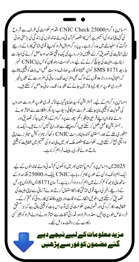 The Ehsass Program CNIC Check 25000 initiative is a financial support scheme launched by the government to help low-income families manage the rising cost of living. This program enables eligible individuals to receive a one-time cash assistance of 25,000 rupees by verifying their status through their national identity card.