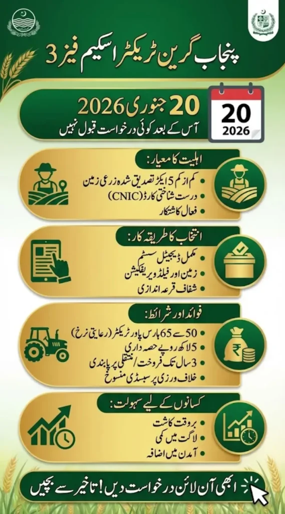 The countdown has officially started for Punjab’s farmers. The Punjab Green Tractor Scheme Phase 3 has entered its final stage, and the government has clearly announced 20 January 2026 as the last date to apply. The scheme is strictly for genuine farmers with a minimum of 5 acres of verified land and a valid CNIC.